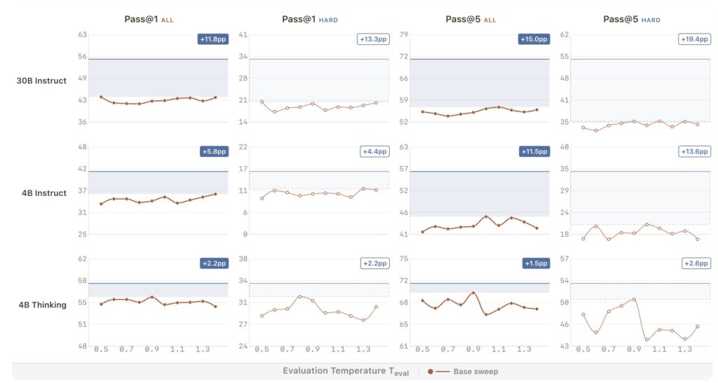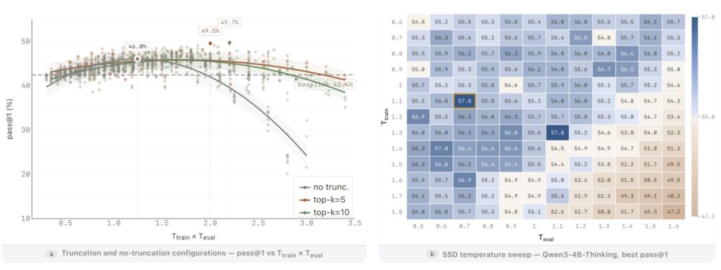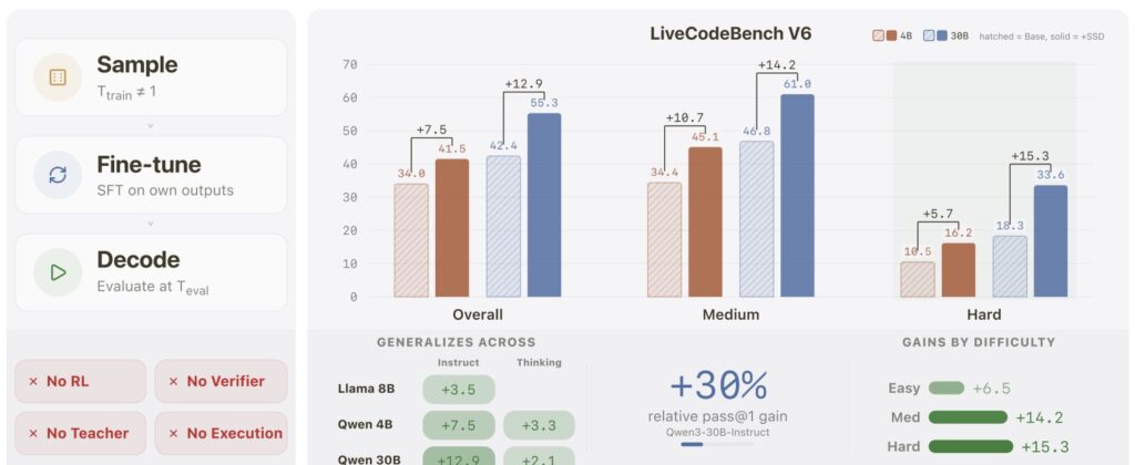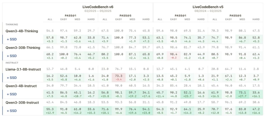The results speak for themselves. When applied to the Qwen3-30B-Instruct model, SSD pushed its pass@1 rate on the challenging LiveCodeBench v6 from 42.4% up to an impressive 55.3%. Notably, these gains were heavily concentrated on the hardest problems. Furthermore, this isn’t a one-off anomaly; the technique generalizes beautifully across different architectures, including Llama and Qwen models at the 4B, 8B, and 30B scales, working for both standard instruct models and newer “thinking” variants.