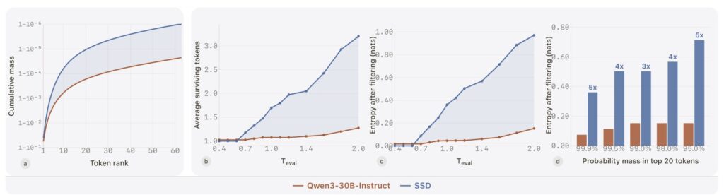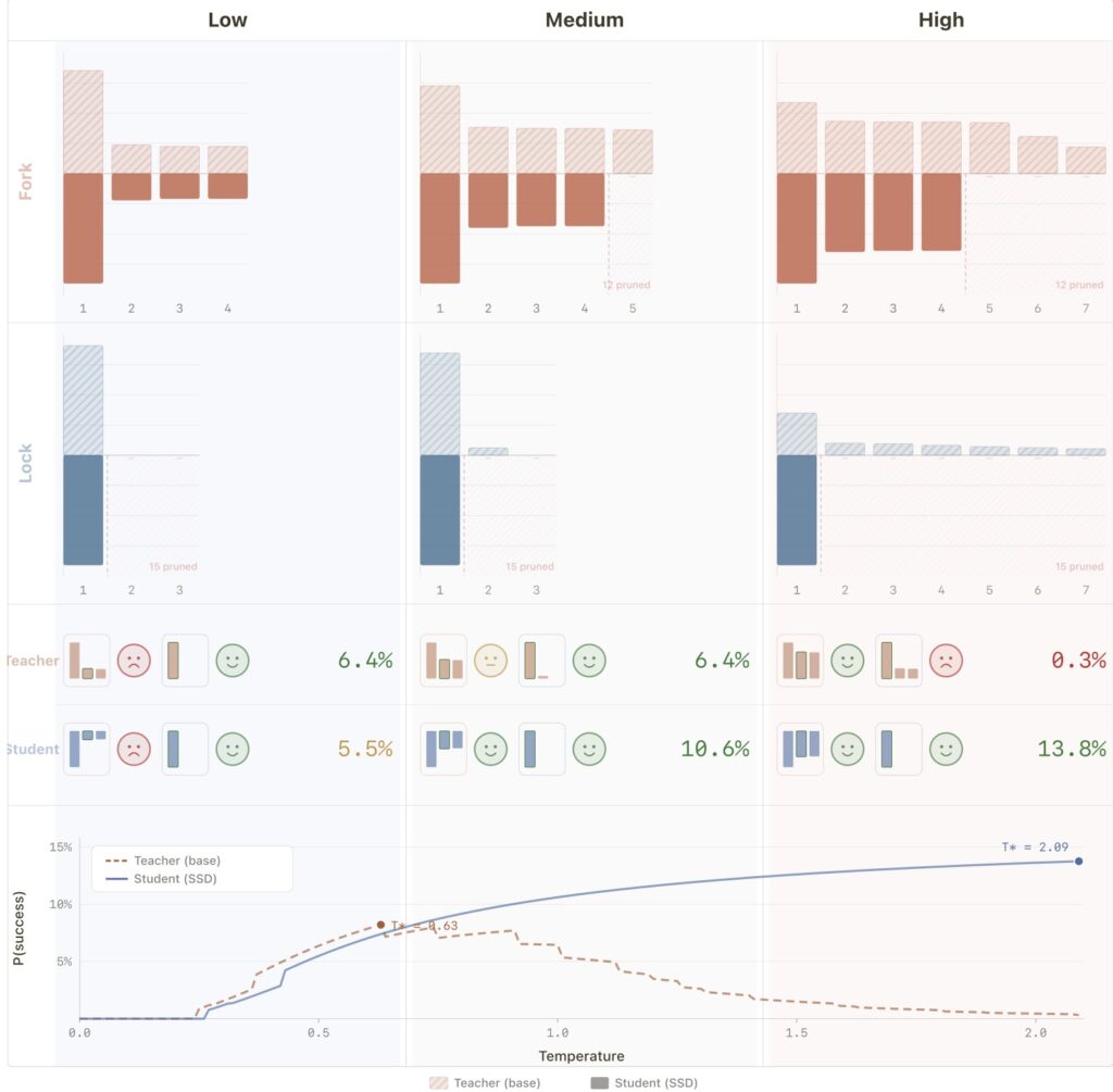 Apple’s research traces the success of SSD directly to its ability to resolve this conflict. The method fundamentally reshapes token distributions in a highly context-dependent way. When precision is paramount, SSD suppresses the “distractor tails”—the low-probability, incorrect guesses that often lead a model to hallucinate bad syntax. Conversely, when exploration is needed, SSD preserves useful diversity, allowing the model to think outside the box.