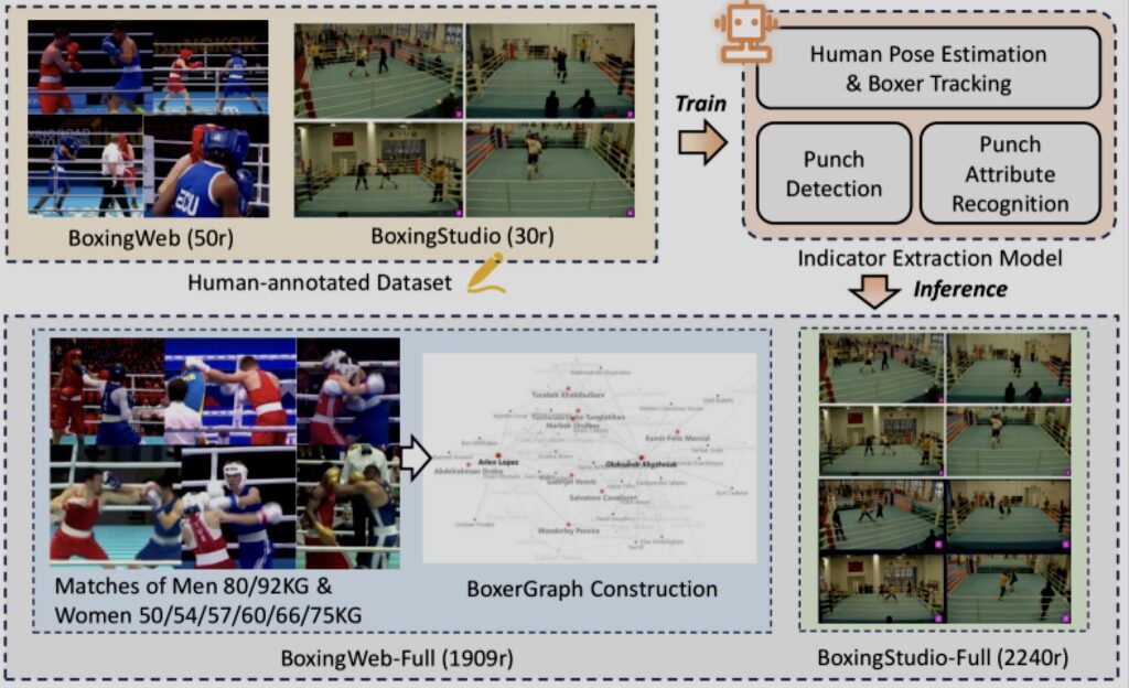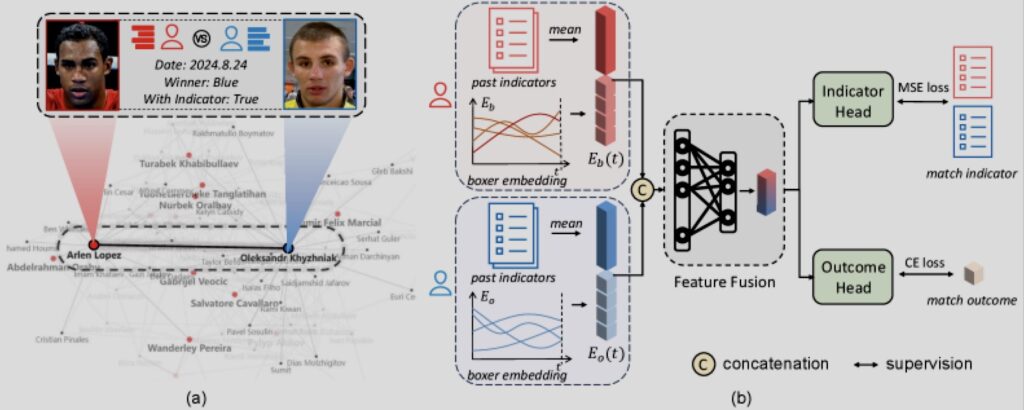 By analyzing match footage, the system breaks down the chaos into precise temporal boundaries with spatial and technical attributes. It parses the fight into 18 hierarchical technical-tactical indicators. Rather than offering vague advice like “be more aggressive,” the system quantifies the exact mechanics of the fight. It feeds these indicators into a graph-based predictive model (BoxerGraph), fusing explicit technical profiles with learnable, time-variant latent embeddings. In simple terms, it captures the unique, shifting rhythm of specific boxer matchups.