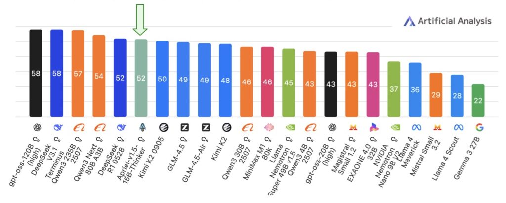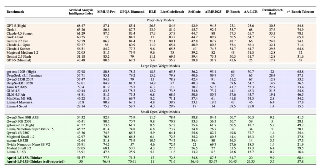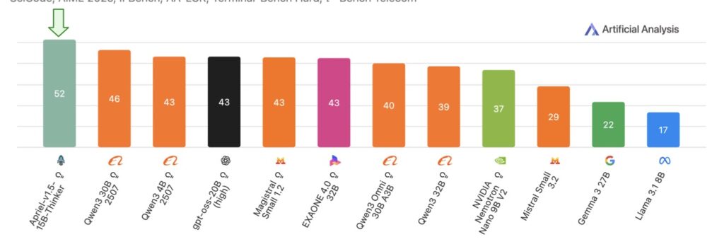 Building on this robust base, the third stage introduces high-quality text-only supervised fine-tuning (SFT) using curated instruction-response pairs enriched with explicit reasoning traces. Spanning domains like mathematics, coding, science, and tool use, these traces guide the model to “think” step-by-step, mimicking human-like deliberation without the complexity of reinforcement learning from human feedback (RLHF) or preference optimization. This isolation of the training recipe’s contributions is a key insight: Apriel-1.5-15B-Thinker achieves competitive results purely through its data-driven pipeline, underscoring the power of high-signal SFT to refine reasoning without additional bells and whistles. The outcome? A model that not only competes but often surpasses expectations in efficiency. On the Artificial Analysis Intelligence Index, it secures a score of 52—on par with the much larger DeepSeek-R1-0528—while demanding far fewer computational resources. In text-based arenas, it shines on rigorous tests like AIME for advanced math and GPQA for graduate-level questions, proving its mettle in pure reasoning.