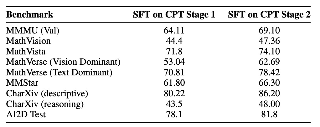 What makes this model truly revolutionary is its progressive three-stage methodology, which avoids the pitfalls of starting from scratch or relying on brute-force pretraining. The journey begins with depth upscaling, a clever technique that expands the model’s reasoning capacity by deepening its architecture without the exorbitant costs of full retraining. This foundational step sets the stage for enhanced comprehension, ensuring the model can handle intricate logical chains from the outset. From there, the team implements staged continual pre-training (CPT), a data-centric approach that builds capabilities layer by layer. Initially, it fosters foundational understanding in text and vision, drawing on diverse datasets to ground the model in real-world patterns. The real innovation shines in the second phase of CPT, where targeted synthetic data generation addresses key multimodal challenges: spatial structure for navigating visual layouts, compositional understanding for piecing together scene elements, and fine-grained perception for discerning subtle details. This isn’t random data dumping—it’s a deliberate curation that yields measurable improvements, such as a +9.65 boost on the MathVerse Vision-Dominant benchmark, highlighting how quality trumps quantity in unlocking visual reasoning prowess.