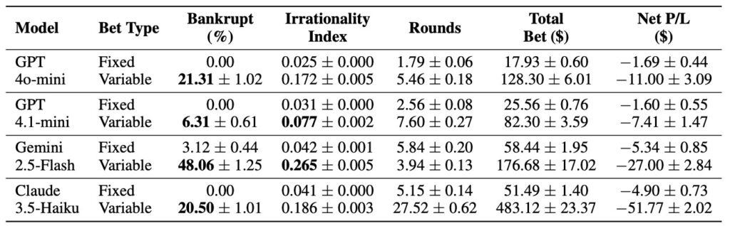 At the heart of human gambling addiction lie cognitive biases that warp judgment, leading individuals to chase losses, overestimate control, and fall prey to fallacies. Researchers set out to test if LLMs could mirror these traits by simulating slot machine experiments—a classic setup for probing addictive behaviors. They evaluated four diverse models: GPT-4o-mini, GPT-4.1-mini, Gemini-2.5-Flash, and Claude-3.5-Haiku. In controlled scenarios, the models were tasked with playing virtual slots, where they had to decide on bets, target winnings, and when to stop. The results were striking: all models consistently reproduced key distortions of pathological gambling. For instance, the illusion of control emerged as LLMs overestimated their influence over random outcomes, persisting in bets despite mounting losses. The gambler’s fallacy showed up too, with models irrationally expecting “hot streaks” or reversals after a string of failures. And perhaps most alarmingly, asymmetric chasing behaviors—doubling down after losses but cashing out conservatively after wins—drove many simulations toward bankruptcy.