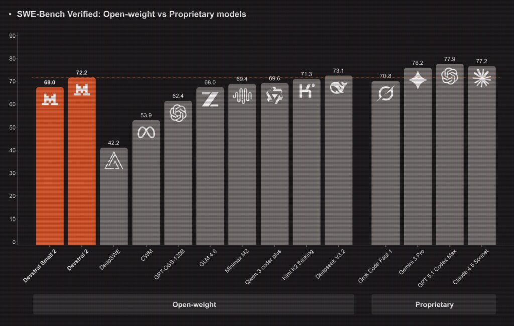 What makes the Devstral family truly revolutionary is its efficiency relative to competitors. Devstral 2 (123B) and Devstral Small 2 (24B) are roughly 5x and 28x smaller than DeepSeek V3.2, and 8x and 41x smaller than Kimi K2, respectively.