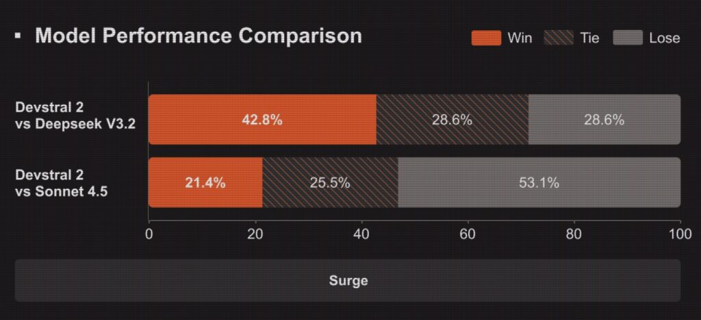 This drastic reduction in size does not come at the cost of capability. In human evaluations scaffolded through Cline, Devstral 2 demonstrated a 42.8% win rate against DeepSeek V3.2. While closed-source models like Claude Sonnet 4.5 still hold a lead in raw performance, Devstral 2 offers a compelling alternative that is up to 7x more cost-efficient for real-world tasks.