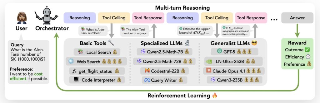 The result of this method is Nemotron-Orchestrator-8B. Despite its relatively small size (8B parameters), this model acts as a conductor for a symphony of digital resources. Given a complex task, the Orchestrator alternates between reasoning and tool calling across multiple turns. It doesn’t just rely on its own weights; it interacts with a diverse ecosystem:
