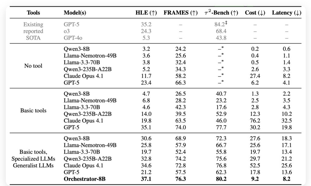 - The Power of Nemotron-Orchestrator-8B: A compact 8B parameter model, trained via ToolOrchestra, achieves a score of 37.1% on Humanity’s Last Exam (HLE), outperforming the massive GPT-5 (35.1%) while being 2.5x more efficient.