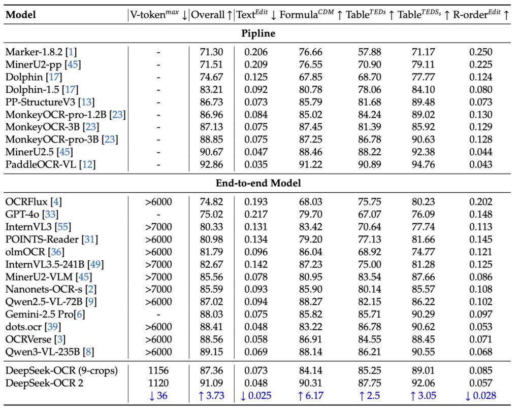 According to the official research paper, the model shows a distinct advantage in environments where V-tokenmax (the maximum number of visual tokens per page) is constrained, maintaining high compression while improving accuracy. By utilizing a “flexible yet semantically coherent scanning pattern,” DeepSeek-OCR 2 achieved a performance boost of over 4% compared to the previous DeepSeek-OCR model, solidifying its position as a leader in document parsing.