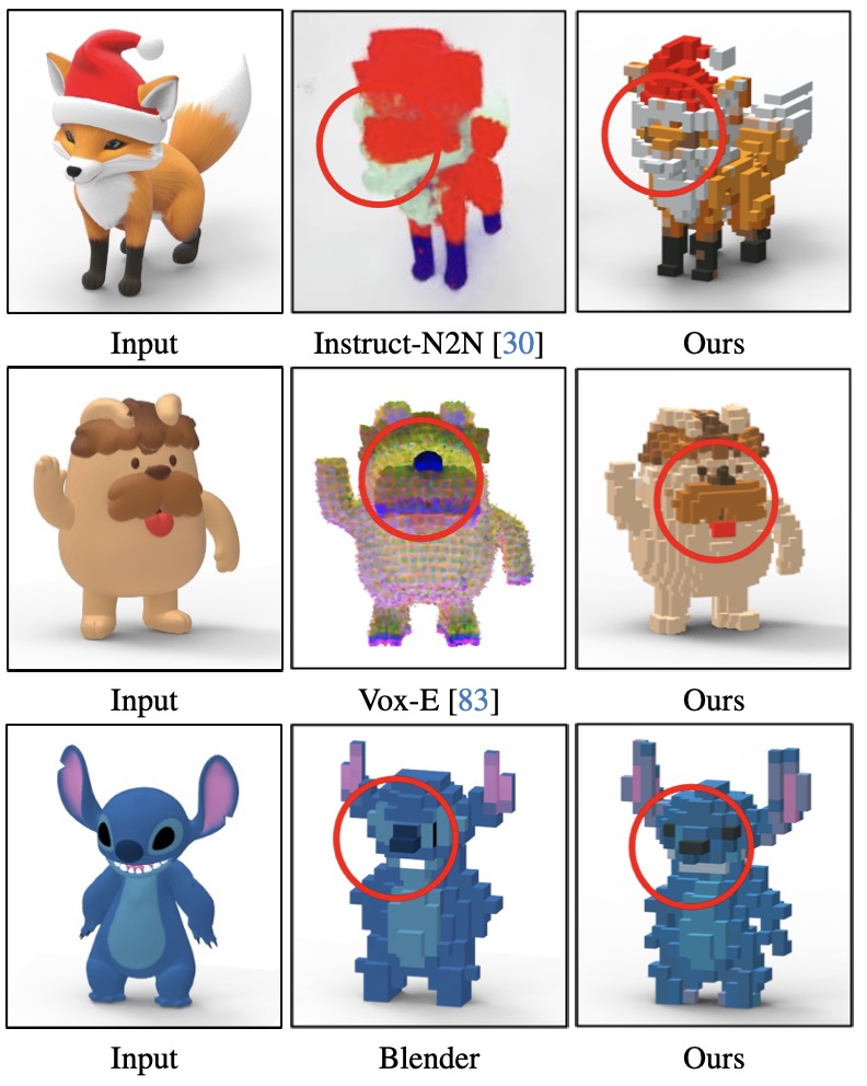 The difficulty lies in a conflict of requirements: how does one abstract geometry into blocks without losing the object’s identity? How does one maintain a limited, coherent color palette while respecting the original texture? Existing methods have historically struggled here, often over-simplifying the geometry or failing to capture the crisp, palette-constrained aesthetics that define the genre.