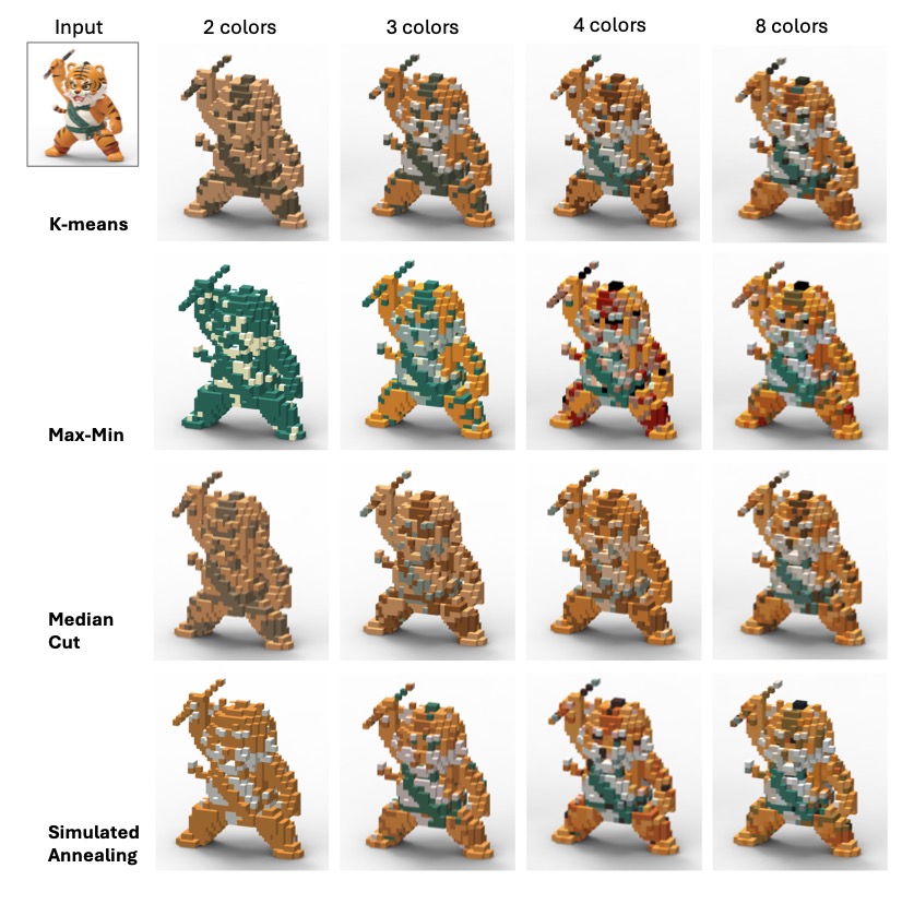 The system is not just powerful; it is flexible. It allows for controllable abstraction, enabling users to dictate the number of colors (e.g., 2 to 8 colors) and resolution scale (20× to 50×). Whether the goal is a minimalist icon or a detailed character model, the framework maintains structural consistency and visual appeal.