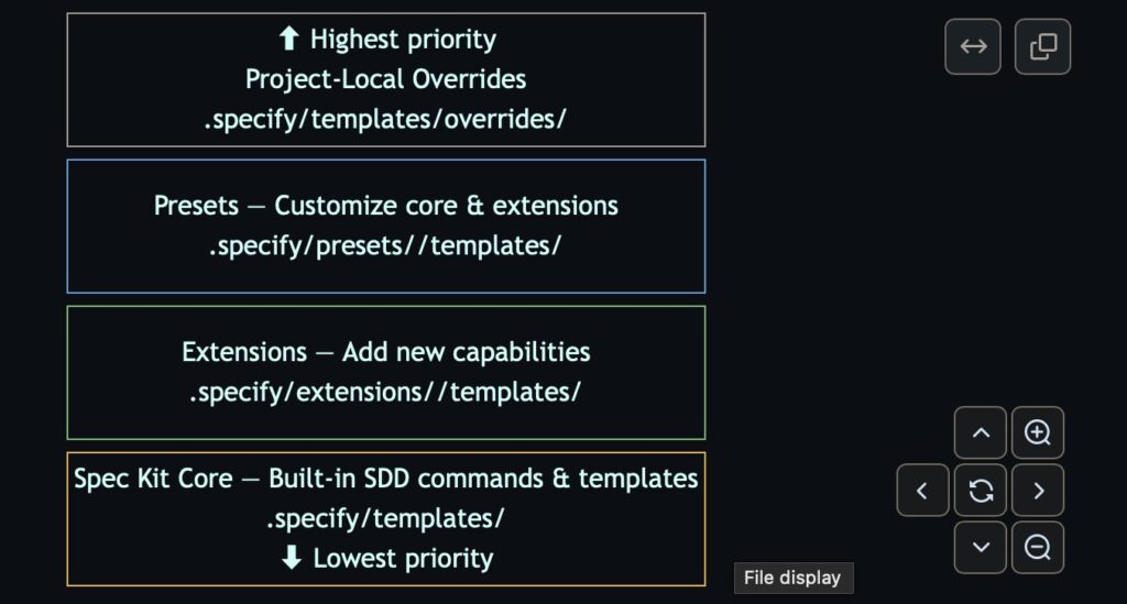 specify preset add) override existing templates and commands. You can enforce a compliance-oriented spec format, mandate security review gates, adapt the workflow to Agile or Domain-Driven Design, or enforce test-first task ordering. - Project-Local Overrides: For one-off adjustments, developers can drop templates into