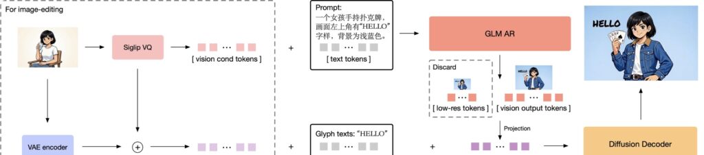 - The Auto-Regressive Generator (The Brain): Initialized from the GLM-4-9B-0414 language model (9 billion parameters), this component is responsible for processing the text and generating “tokens” that represent the low-frequency semantic layout of the image. It understands what should be in the image.