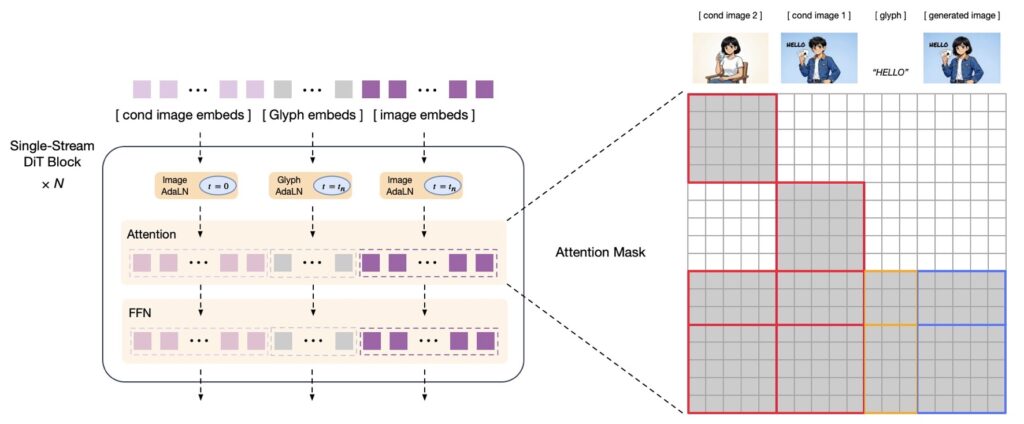 For image editing, the model utilizes a block-causal attention mechanism (similar to ControlNet-Reference-Only). This allows the model to reference original images to preserve high-frequency details without the heavy computational overhead of full attention mechanisms used in competitors like Qwen-Image-Edit.