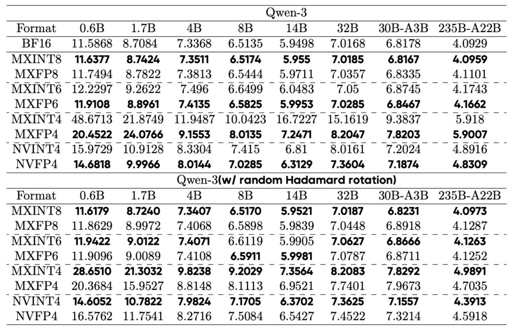 Diving deeper into lower bit widths, the trade-offs become even more nuanced. For 4-bit formats, FP variants like MXFP4 and NVFP4 typically hold an accuracy advantage, better preserving model performance amid aggressive compression. However, the study demonstrates that this isn’t set in stone. By applying outlier-mitigation techniques such as random Hadamard rotation—a method that rotates data to distribute outliers more evenly—NVINT4 can actually surpass NVFP4 in accuracy. This highlights how clever algorithmic tweaks can elevate INT formats, challenging the notion that FP is inherently better for low-bit scenarios. Moreover, the research introduces a novel symmetric clipping method to address gradient bias in fine-grained low-bit INT training. This innovation enables nearly lossless performance for MXINT8 training, ensuring that models don’t just deploy efficiently but also train without unnecessary accuracy hits.