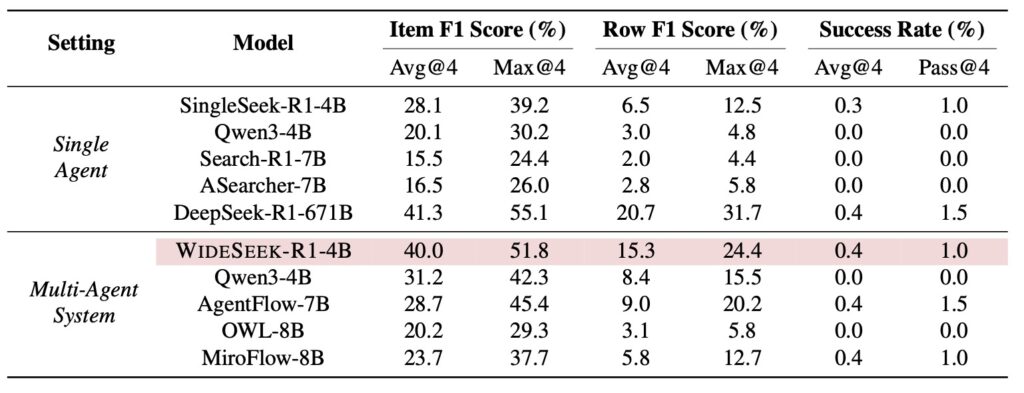The results of this approach are nothing short of disruptive. In experiments using the WideSearch benchmark, the WIDESEEK-R1-4B model (a relatively small 4-billion parameter model) achieved an item F1 score of 40.0%.