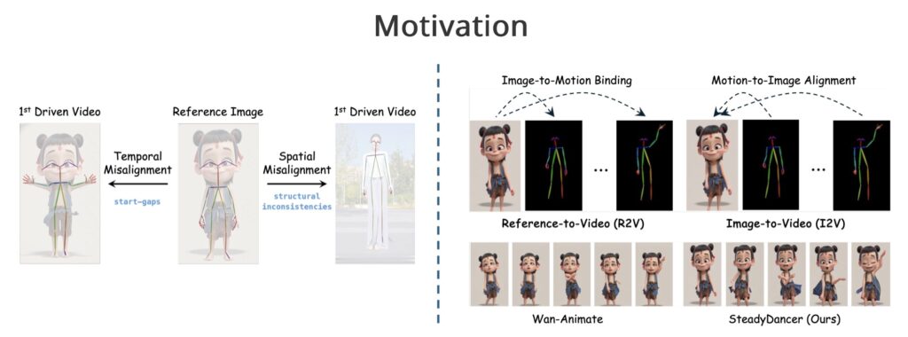 To understand why SteadyDancer is necessary, we must first look at the limitations of the dominant approach, known as the Reference-to-Video (R2V) paradigm. In the R2V model, the system attempts to “bind” a reference image onto a driving pose sequence. While this sounds logical, it often fails in real-world applications due to critical spatio-temporal misalignments.