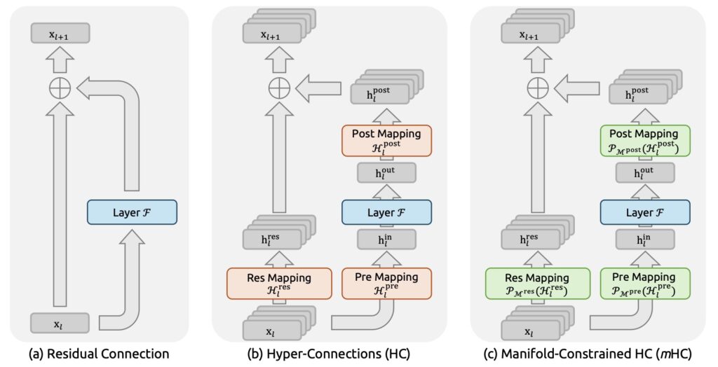 - The Scalability Bottleneck: While recent Hyper-Connections (HC) have boosted AI performance by expanding network width, they fundamentally break the “identity mapping” property, leading to severe training instability and memory overheads in large models.