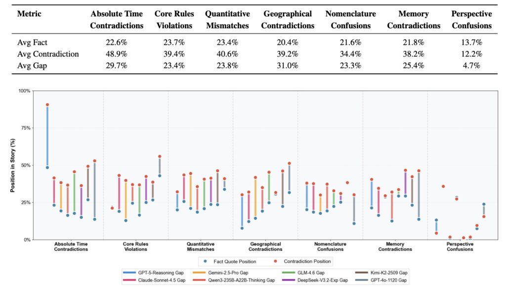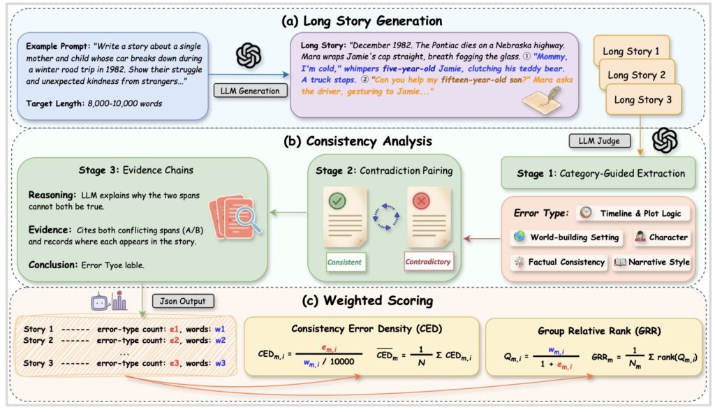 Until now, the AI community has lacked a standardized way to measure this specific flaw. Existing benchmarks have heavily favored plot quality and sentence-level fluency, leaving the insidious problem of cross-context contradictions largely ignored.