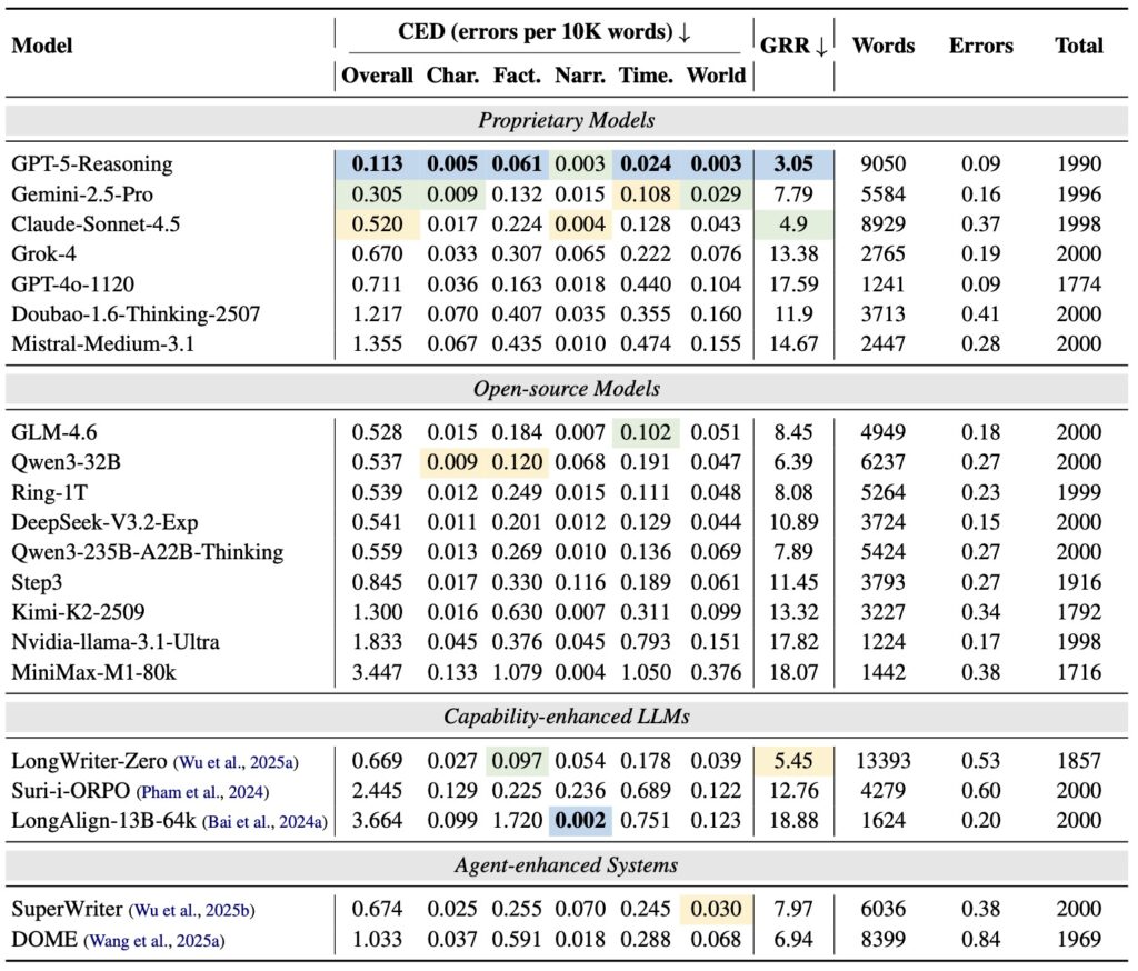 Armed with ConStory-Bench and ConStory-Checker, researchers evaluated a wide array of proprietary, open-source, and agent-enhanced models. To ensure fairness, they established two primary metrics: CED (Consistency Error Density, measuring errors per 10,000 words) and GRR (Group Relative Rank, which controls for the difficulty of the prompt).