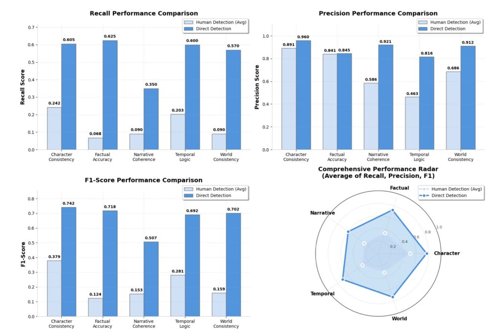 - Predictable Failures: Evaluations reveal that AI consistency errors are not random. They primarily occur in factual and temporal dimensions, tend to cluster in the middle of narratives, and correlate strongly with moments of high textual entropy.