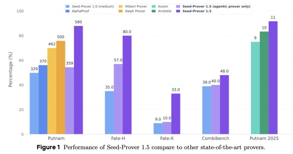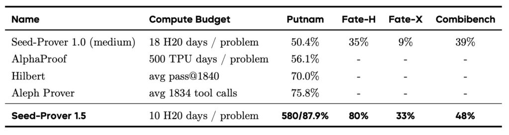 - Unmatched Efficiency and Accuracy:Â Seed-Prover 1.5 outperforms state-of-the-art models with a fraction of the compute budget, solving 88% of undergraduate-level PutnamBench problems and 11 out of 12 problems from the 2025 Putnam competition.