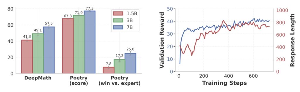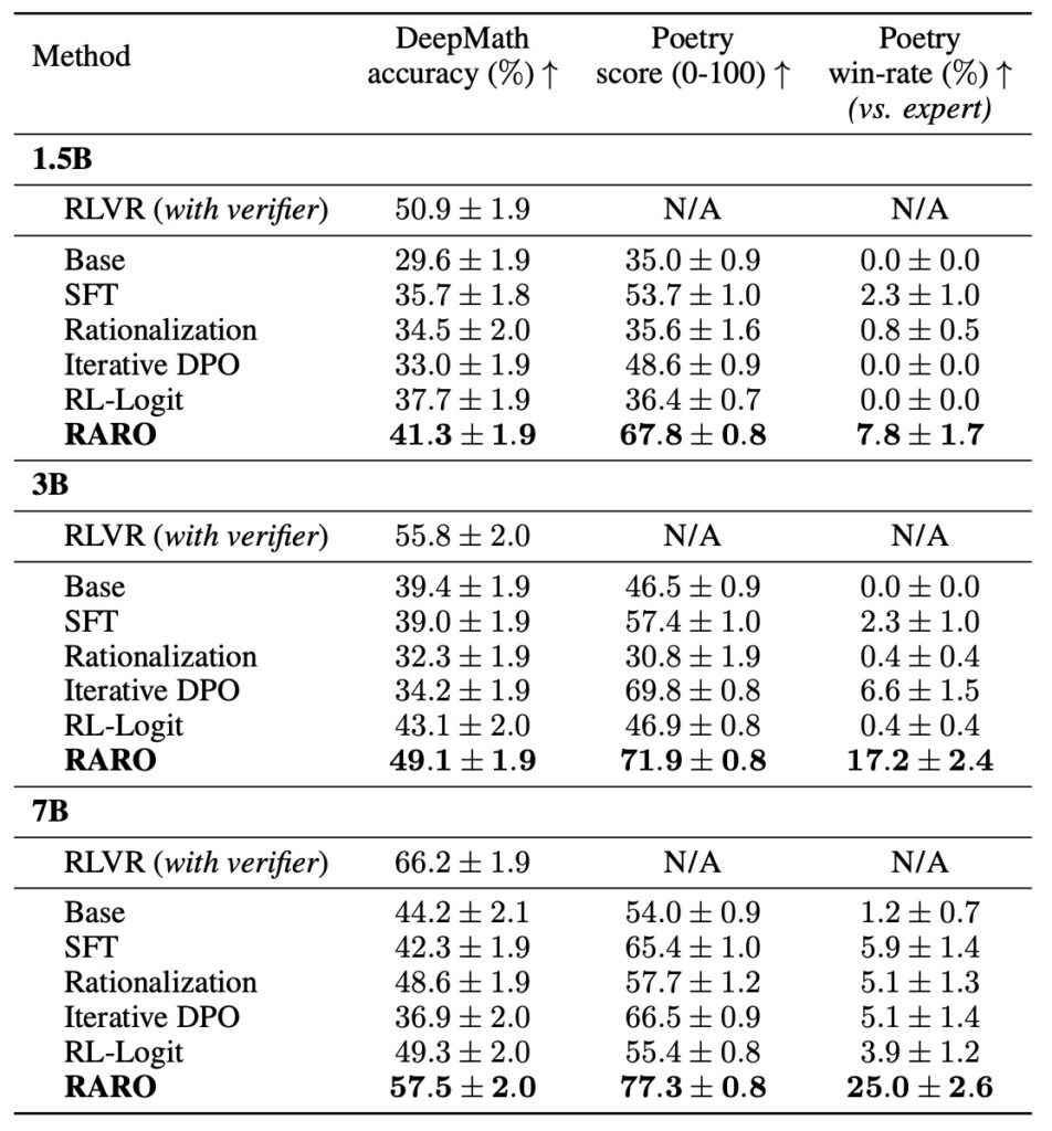Empirically, this method is paying off. RARO significantly outperformed verifier-free baselines on complex tasks including DeepMath, Poetry Writing, and the Countdown game. It even matches the performance of models trained with expensive, task-specific verifiers (RLVR).