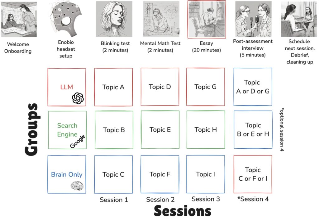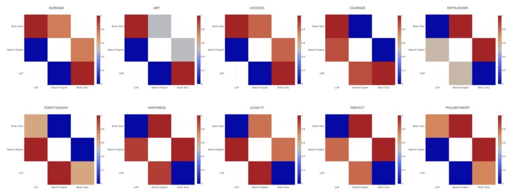 - Neural Disengagement: EEG data showed that participants using LLMs displayed the weakest brain connectivity compared to those using Search Engines or no tools at all, suggesting a significant reduction in cognitive effort.