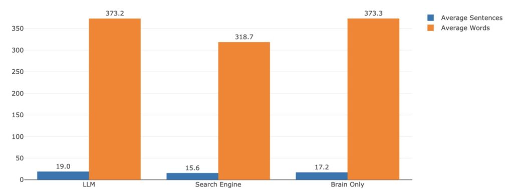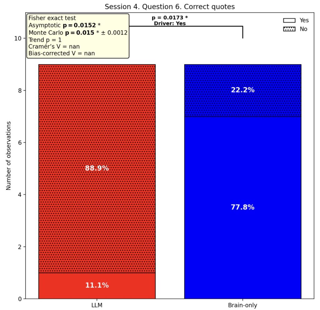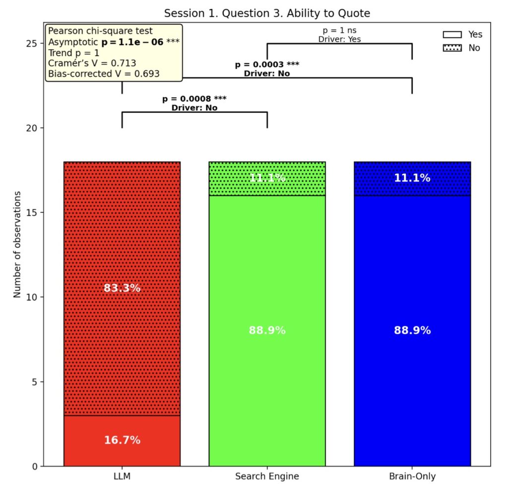 Essays produced by the LLM group lacked diversity. Teachers and AI judges noted that n-gram patterns and topic ontologies were strikingly similar within the group. Furthermore, LLM users reported the lowest self-perceived ownership of their work. In post-session interviews, many could not accurately quote the essay they had “written” just minutes prior.