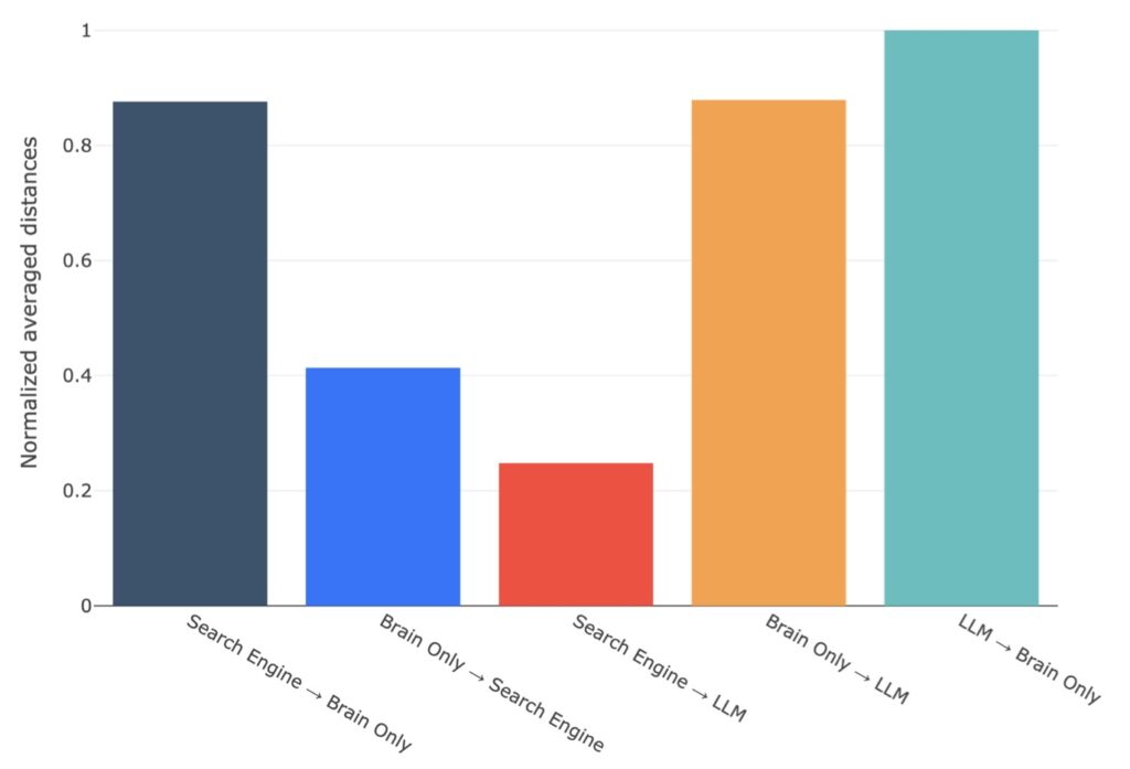 While the Search Engine group maintained strong ownership (though less than the Brain-only group), the LLM users fell into a passive role. They became curators of an algorithmic “echo chamber,” accepting probabilistic answers based on training data rather than formulating independent arguments.