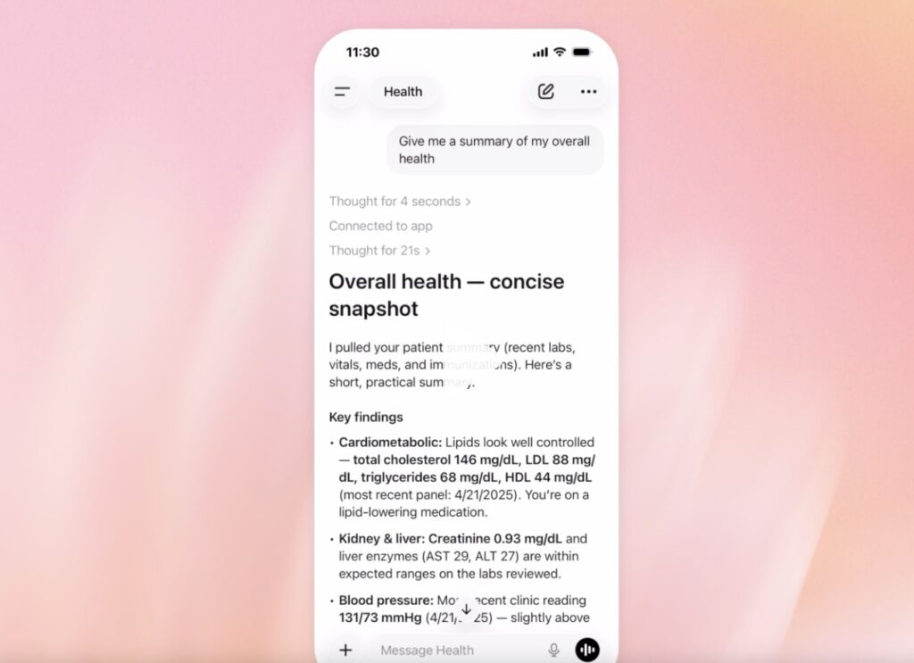 ChatGPT Health is not just a chatbot; it is a specialized environment designed to ground conversations in your specific medical reality. By securely connecting to medical records (via the b.well network in the U.S.) and popular wellness apps, the AI moves beyond generic advice. You can now ask complex, personalized questions such as “How is my cholesterol trending over the last year?” or “Can you summarize my latest bloodwork before my doctor’s appointment?”