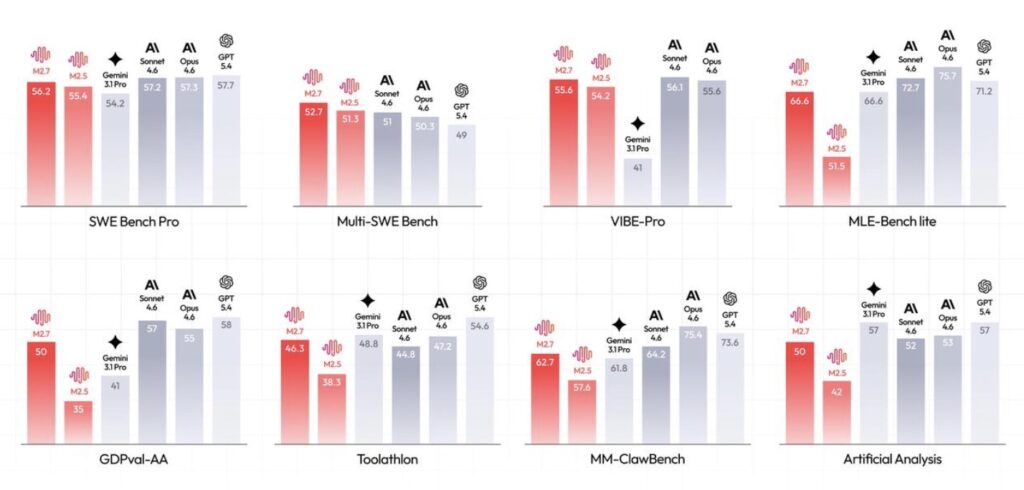 - Unprecedented Software Engineering: M2.7 excels in end-to-end project delivery and live debugging, matching state-of-the-art models with a 56.22% on the SWE-Pro benchmark and reducing live incident recovery times to under three minutes.