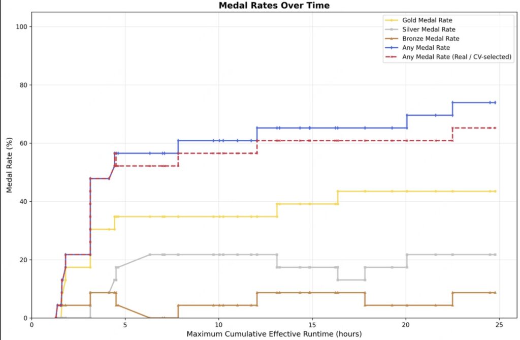 This capability was put to the test in low-resource machine learning competitions (OpenAI’s MLE Bench Lite). Running on just a single A30 GPU, M2.7 utilized short-term memory, self-criticism, and self-optimization to iterate over 24 hours. The result? An average medal rate of 66.6% across three runs—tying with Gemini-3.1 and netting 9 gold, 5 silver, and 1 bronze medal in its best run.