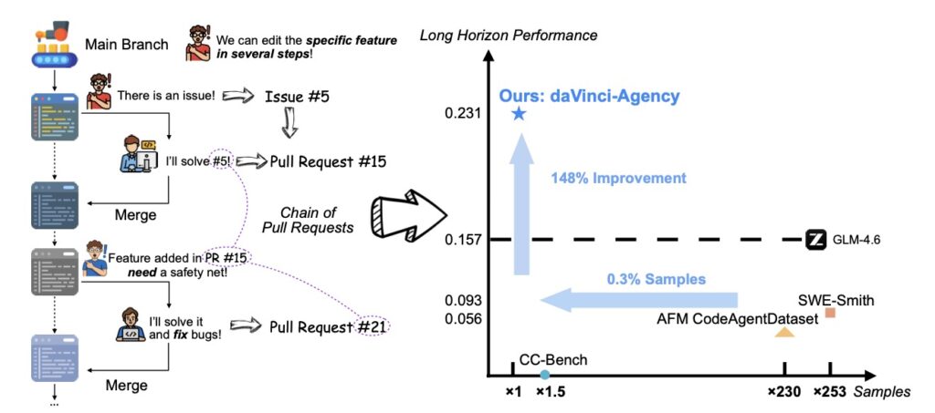 - The PR Solution: daVinci-Agency solves this by mining real-world Pull Request (PR) chains, treating the natural evolution of software as a roadmap for teaching agents how to decompose tasks and maintain consistency.
