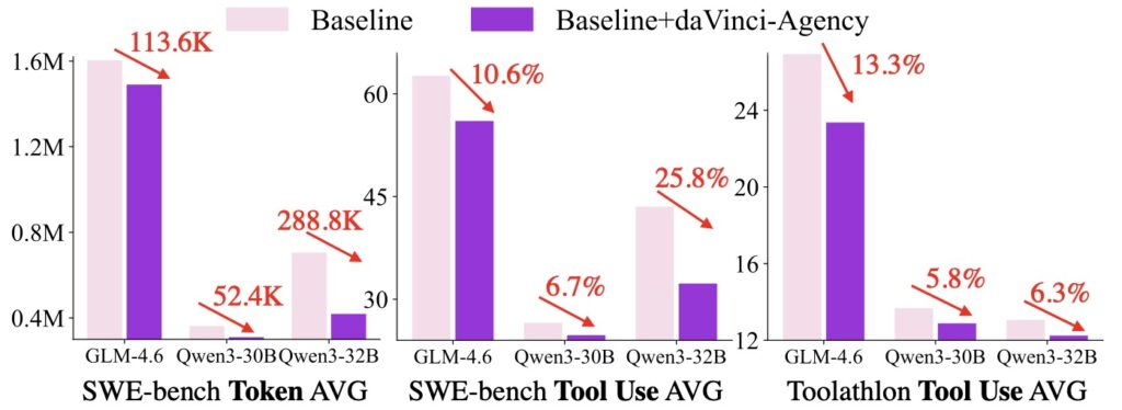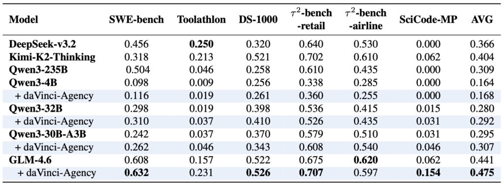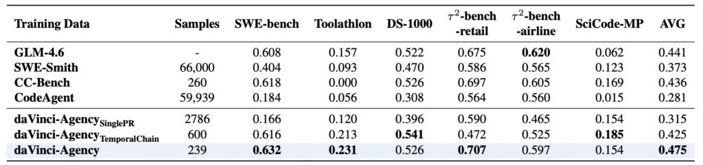 Perhaps the most startling finding from the daVinci-Agency research is its extreme data efficiency. In an era where “more data” is the common refrain, this method proves that structure is king. By fine-tuning the GLM-4.6 model on a mere 239 samples, researchers observed broad improvements across multiple benchmarks. Most notably, the model achieved a 47% relative gain on Toolathlon, a benchmark designed to test complex tool-use and planning.