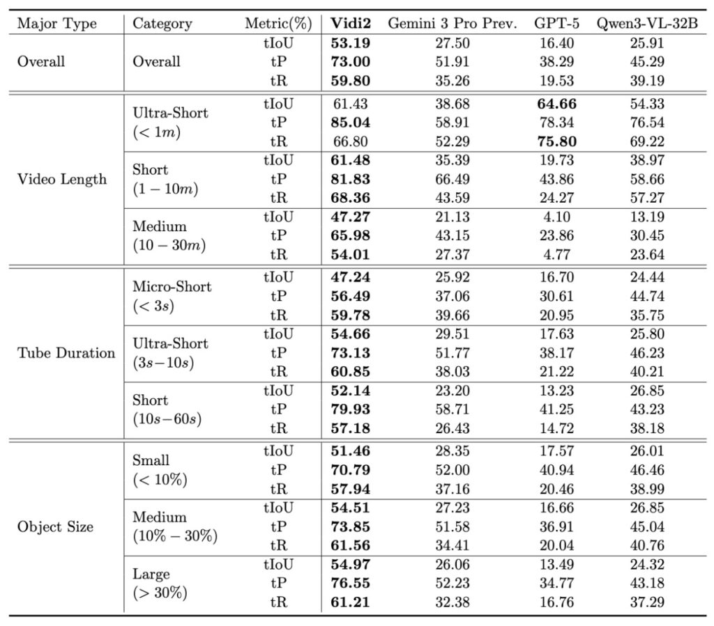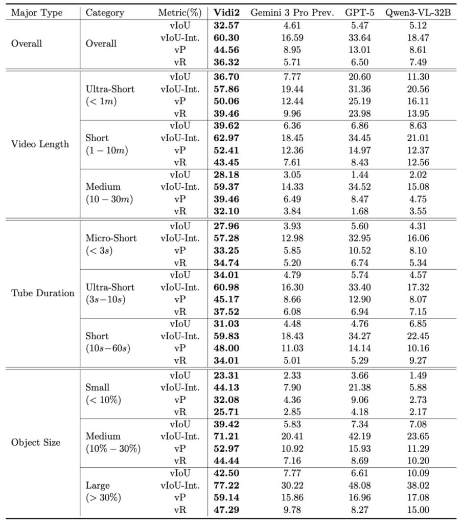 To validate these capabilities, the team introduced a new benchmark called VUE-STG. Unlike previous tests, this benchmark evaluates models on videos ranging from 10 seconds to 30 minutes, ensuring the AI can handle long-context reasoning. It uses high-quality, manually annotated data to test how well the model handles user-style queries. In these rigorous tests, Vidi2 substantially outperformed Gemini 3 Pro (Preview) and GPT-5, proving that it isn’t just a theoretical advancement, but a practical leader in the field.