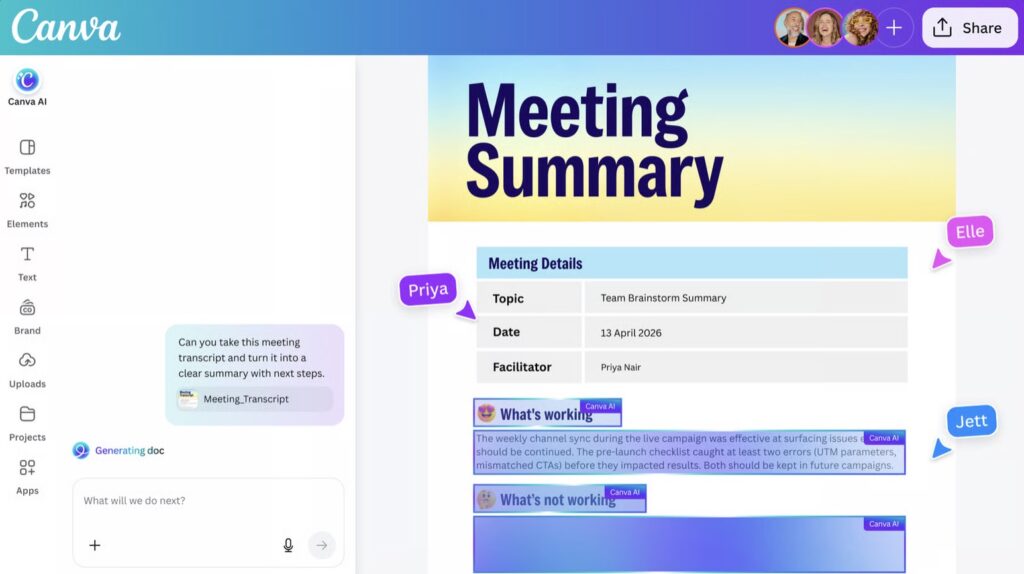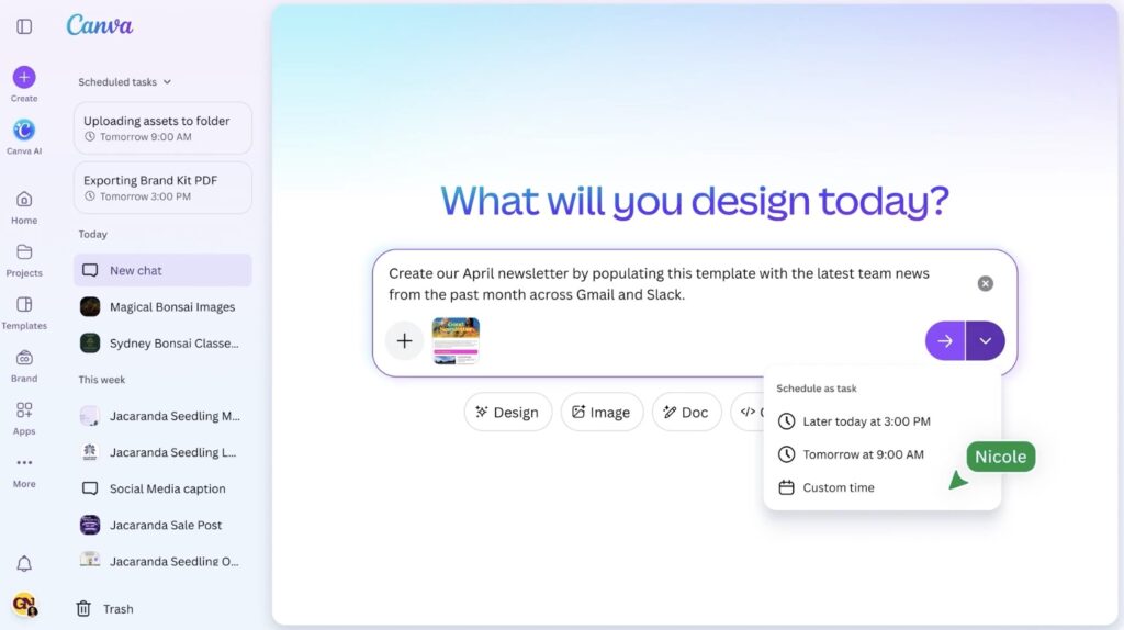 To extend this foundational intelligence across the entire creative process, Canva is also introducing six new intelligent workflows designed to make the platform the place where teams start and end their day. Through Connectors, Canva AI plugs directly into your existing ecosystem—including Slack, Gmail, Google Drive, Notion, and Zoom. You can now effortlessly generate meeting summaries from Zoom transcripts or turn customer emails into personalized, on-brand sales pitches. Meanwhile, a new Scheduling feature puts your work on autopilot. You can set tasks to run in the background while you are offline, ensuring your weekly social content or morning briefing documents are ready the moment you log in.