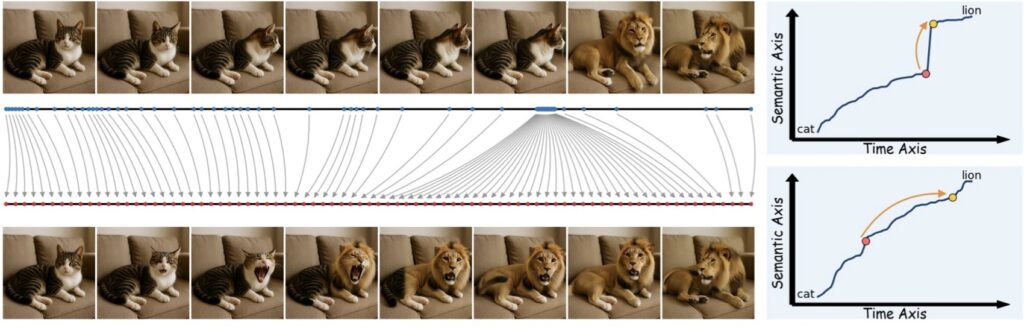 Identifying the problem is only half the battle; fixing it is where the SPF truly shines. Building on this diagnostic foundation, researchers proposed “semantic linearization.” This is a procedure that reparameterizes, or retimes, the sequence so that the semantic change unfolds at a constant, steady rate. The beauty of this framework lies in its flexibility. It offers two complementary methods for achieving this smooth evolution: direct intervention during the actual generation process (by temporally warping the AI’s positional embeddings) and post-hoc linearization of existing, already-rendered videos through segmented regeneration. Because this framework is model-agnostic, these techniques yield smoother, highly coherent transitions without the expensive need for model retraining or tedious manual frame annotation.